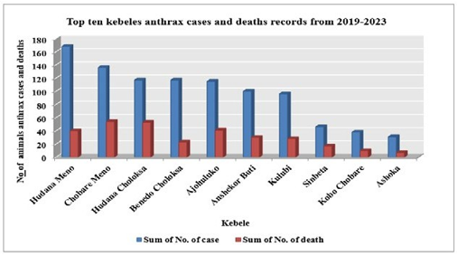 Figure 4: Top Ten kebeles Anthrax Cases and Deaths in Halaba Zone from 2019-2023
