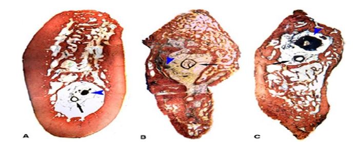 Figure 1: Histology Section of Undecalcified Tissue. A: Control Tissue; B: Regenerate Tissue at 12 Weeks; C: Regenerate Tissue at 18 Weeks [9]