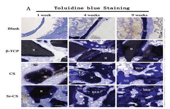 Figure 5: Undecalcified Tissue Section Results, Toluidine Blue Staining. Implant Materials (M) Appear Black or Gray; New Bone (NB) is Stained Blue (Osteocyte Lacunae Can Be Clearly Observed). "Apatitic" Intermediate Layer (M′), Lacking Lacunae, Found for CS and Sr-CS. Scale Bar: 100μm