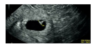 Figure 5: ultrasound imaging of the single IUP; Crown Rump Length is 0.5cm consistent with 6.1week gestational age with fetal cardiac activity of 113BPM