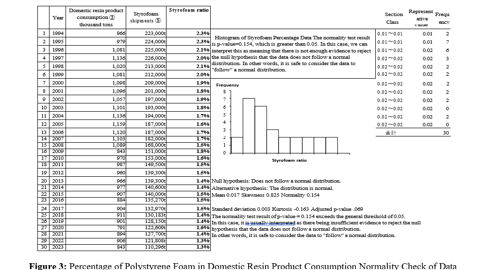 When EPS and PET are produced, the statistical data is as follows: First, as data on the amount of plastic production, the Plastic Waste Management Association publishes data on the change in domestic consumption of resin products over time [5]. In addition, data on the amount of polystyrene foam shipped was obtained from the Expanded Polystyrene Association, and for PET, data on the actual demand for PET resin for bottles was obtained from the PET Bottle Recycling Promotion Council [6,7]. The proportion of the actual demand for polystyrene foam in domestic consumption of resin products and the proportion of the change in PET over time were obtained. In addition, when the normality was checked only for the time series data of the proportion of ESP in domestic consumption of resin products, a histogram like that shown in Figure 3 was created, and since the P value is 0.154 and exceeds 0.05, the null hypothesis that "the null hypothesis does not follow a normal distribution" is not rejected. The time series data on the proportion of ESP in domestic resin product consumption can be considered to follow a normal distribution.
