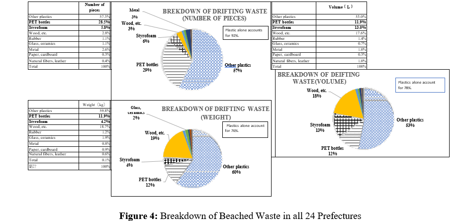 Looking at the 24 prefectures for which the number, volume, and weight are all available, as shown in Figure 4, plastics account for 92% of drifting waste by number, 78% by volume, and 76% by weight, meaning that, excluding wood, most drifting waste is plastic. Among them, polystyrene foam accounts for 6% by number, 13% by volume, and 4% by weight. PET account for 29% by number, 12% by volume, and 12% by weight.