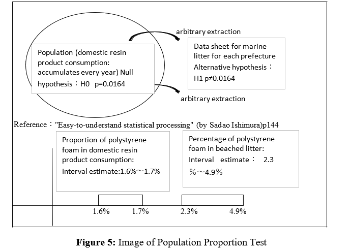In the population proportion test (bottom of Table 1), the null hypothesis is that the 20-year average proportion of styrofoam in domestic consumption, which is the population, is 1.6% (data A), and the proportion of styrofoam in drifting waste in each prefecture, which is randomly selected from 20 cases, is the same 1.6%. As a result of the population proportion test, the p-value is less than 0.05, so the null hypothesis that the proportions are the same is rejected, and the alternative hypothesis that the proportions are not the same, the average proportion of data A, 3.6% (estimated interval 2.3% to 4.9% at a significance level of 5%), is adopted. As can be seen in the lower interval estimate of Figure 5, the interval estimates of 1.6-1.70% for "the proportion of polystyrene foam in domestic resin product consumption" does not overlap with the interval estimate of 2.3-34.9% for "the proportion of polystyrene foam in marine litter." The proportion of polystyrene foam in marine litter is roughly twice as high as the proportion of polystyrene foam in plastic products at the time of production, and polystyrene foam products are roughly twice as likely to scatter.