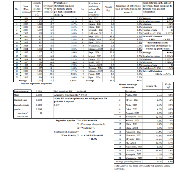 Regression equation Y (volume) = 1.6786 x X + 0.0543, coefficient of determination 0.6247 If X = 3.6% is substituted into this equation, Y = 11.5%. In other words, if restrictions are imposed on the manufacture, sale, and use of polystyrene foam, the regression equation above suggests that plastic scattering could be reduced by about 4% by weight and about 10% by volume.
