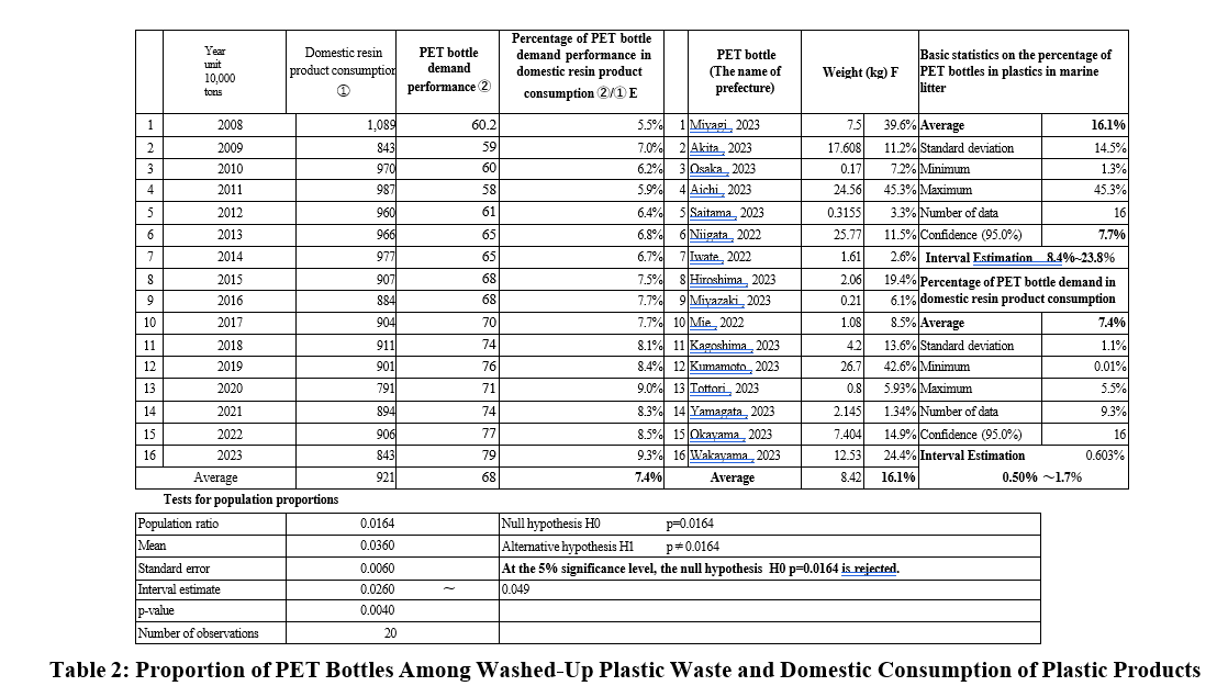 Similarly, for PET in Table 2, the 16-year average proportion of PET in the population of domestic consumption (7.4% data E) is the same as the null hypothesis that the proportion of PET in the drifting waste of each prefecture (16 randomly selected cases from that population) is the same average proportion of 7.4%. As a result of the population proportion test, the p-value is less than 0.05, so the null hypothesis that the proportions are the same is rejected, and the alternative hypothesis that the proportions are not the same, the average proportion of the F data, 16.1% (estimated interval 8.4% to 23.8% at a significance level of 5%), is adopted. The proportion of PET in drifting waste is roughly twice as high as the proportion of PET in plastic products at the time of production, and like styrofoam products, PET are roughly twice as likely to scatter.