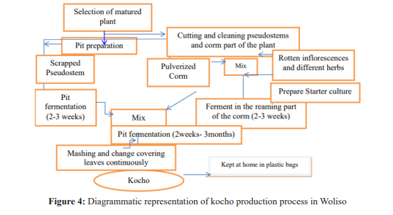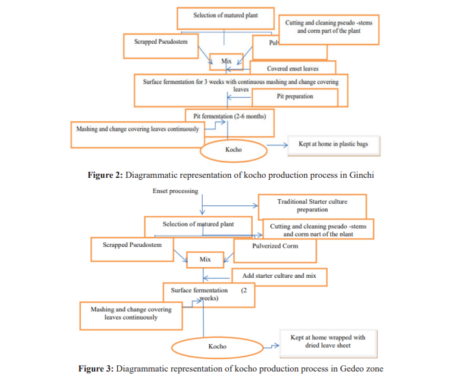 Annual production of enset plant in Ethiopia is 6543 kg/ha and 4.5 million tons of kocho are available as standing stock. Relative to other crops its highly productive, drought tolerate and obtained throughout the years and stored without the need of refrigerator, where it makes a major contribution to food security of the coun¬try. Regions where enset is used as staple food are usually less affected by the recurrent drought periods that occur in Ethiopia. The overall objective of this paper is to review the characteristics of indigenous kocho processing practice and research drawing op¬portunity mechanisms and pathways intersection in correlation to microbial, biochemical and fermentation conditions.