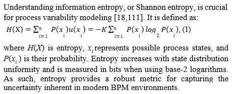 Entropy has demonstrated wide applicability across disciplines— from financial markets to healthcare systems [9,21,26,40– 42]. Shannon entropy, in particular, offers robust tools for quantifying uncertainty and enhancing process optimization [9,17,20,21,26,29,36,43]. In the BPM context, entropy can support the detection of inefficiencies, guide predictive modeling, and refine operational planning [4,9,17, 20,26,29,36, 43,44].