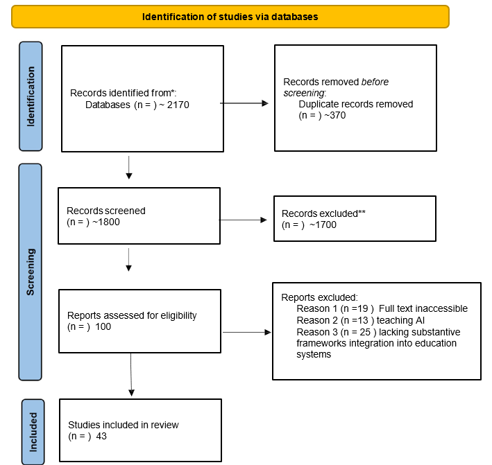 A total of 43 publications that met our inclusion criteria were selected from reputable sources such as IEEE, Springer, Taylor & Francis, Elsevier, MDPI, and others. Inclusion criteria were peer- reviewed studies published between 2021 and 2025 addressing AI integration in formal educational settings. Of these, ~30 publications presented conceptual or theoretical frameworks for AI integration (including policy guidelines and models), and ~13 sources included international agencies which published competency frameworks and strategy recommendations, as well as academic research articles and a few conference proceedings, a few were empirical studies evaluating AI interventions or teacher adoption in educational settings. Exclusion criteria were non-peer- reviewed documents, purely technical papers without pedagogical relevance, and articles unrelated to education. Due to lack of effect size data, a qualitative thematic synthesis was adopted.