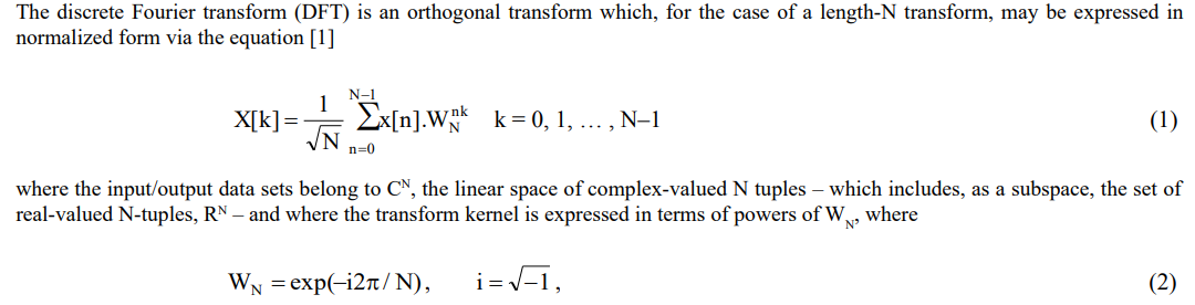the primitive Nth complex root of unity [2,3] – the normalizing term 1 N will be left out of equations hereafter for ease of analysis. Fast solutions to the DFT are based upon the divide and conquer principle and referred to generically as fast Fourier transform (FFT) algorithms [5,6,13]. When the transform length N is expressible as some power of a fixed arbitrary positive integer, R, such that