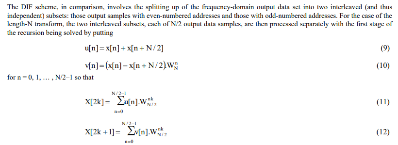 The first decimation scheme to be discussed is that of the DIT which, for the simple case of the radix-2 FFT (illustrated here for ease of analysis), involves the splitting up of the time-domain input data set into two interleaved (and thus independent) subsets: those input samples with even-numbered addresses and those with odd-numbered addresses – noting that extending this to the radix-4 algorithm involves splitting the even-numbered addresses into two interleaved subsequences of even-numbered addresses and the odd-numbered addresses into two interleaved subsequences of odd-numbered addresses, and so on for higher power-of-two radices. For the case of the length-N transform, the two interleaved subsets, each of N/2 input data samples, are then processed separately with the first stage of the recursion being solved by putting