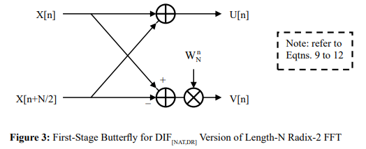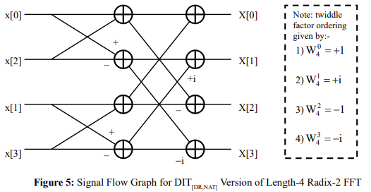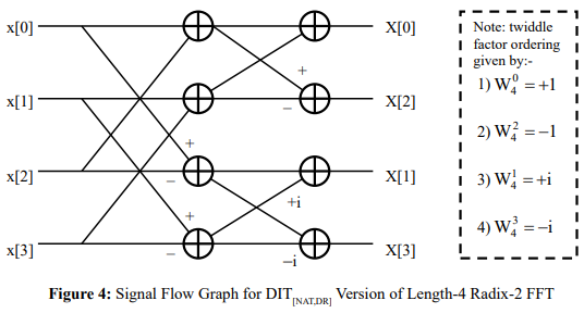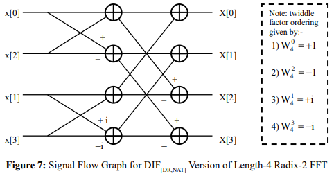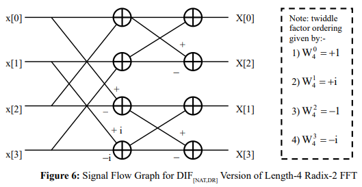 The DIF version of the radix-R FFT, where the input data set is ordered according to the NAT mapping and the output data set according to the DR mapping, is denoted hereafter by DIF[NAT,DR] – see the example of Figure 6 where, from the SFG, it is evident that the powers of W4 must be ordered according to that of the input data set, namely via the NAT mapping. The stride for the first stage of butterflies has a value of two, whilst the stride for the second stage of butterflies has a value of one. Generalizing, for the case of a length-N radix-R FFT, the stride will decrease from one stage to the next by means of a multiplicative scale factor of 1/R, with the first stage having a value of N/R and the last stage having a value of one and the twiddle factors ordered according to that of the input data set, namely via the NAT mapping. Also, the first stage involves N/R sets, each of just one CUR, with that CUR using its own distinct set of R twiddle factors (so that the first stage exploits all N twiddle factors), whilst the second stage involves N/R2 sets, each of R independent CU ’s, with those CUR’s in each set using the same set of R twiddle factors. Continuing in this fashion, with the number of CUR sets decreasing from one stage to the next by a multiplicative scale factor of 1/R, it is evident that the last stage involves just one set of N/R independent CUR’s, all using the same set of R twiddle factors.