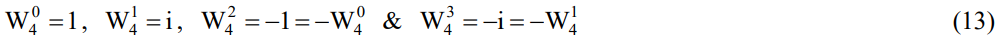 Note that the term WN referred to in this section is that of the primitive Nth complex root of unity, as given by Equation 2, so that for the length-4 FFT examples provided