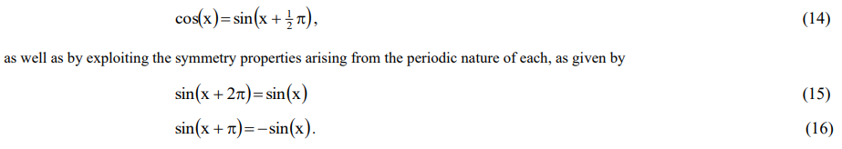 The memory requirement for the twiddle factor generation has been minimized through the exploitation of the periodic and symmetrical nature of the fundamental trigonometric functions from which the associated transform kernels are derived, namely the sine and cosine functions. The basic properties of these two complementary functions are as described by Equations 14 to 16 above, with the sinusoid being an even symmetric function relative to any odd-integer multiple of the argument