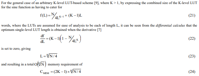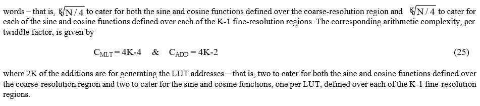 / 2 radians. As a result, the LUT may be accessed by means of a single, easy to compute, input parameter which may be updated from one access to another via simple addition using a fixed increment – that is, the addresses form an arithmetic sequence. Thus, for the case of a length-N FFT, it is required that the LUT be of length N/4, yielding a total memory requirement, denoted CMEM , of