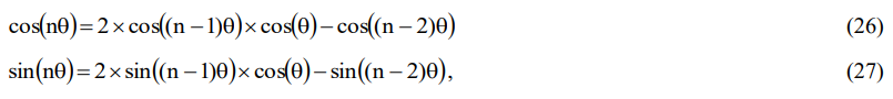 where ‘n’ is an arbitrary positive integer > 1. Such an approach to the computation of the non-trivial twiddle factors involves just two multiplications, two subtractions and two left-shift operations (each such operation being of length one, as used to implement multiplication by two) per twiddle factor. These two generic equations, which are both recursive equations of order two – each being commonly referred to as a second-order recursion or recurrence relation – enable each twiddle factor to be obtained directly from previously computed twiddle factors, in a simple recursive manner, rather than from one or more suitably sized LUTs.