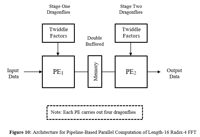 An attraction of the fixed-radix formulations of the FFT is that they lend themselves quite naturally to a parallel implementation. As has already been stated, the computation of the length-N radix-R FFT can be broken down into logRN stages, each of N/R independent CUR’s, whereby the stages may be said to be defined over the temporal domain whilst the CUR’s within any given stage may be said to be defined over the spatial domain. Note that whilst the CUR relates to the set of repetitive arithmetic operations required to be computed by the FFT algorithm, with a hardware implementation in mind the processing element (PE) referred to hereafter relates to the associated hardware operators (such as logic-based adders and fast embedded multipliers, as provided by the computing device manufacturer) required for carrying out those operations. The remainder of this section looks briefly into how high-throughput parallel solutions to the fixed-radix FFT might be obtained by exploiting the inherent parallelism within each of these two domains. The techniques discussed are illustrated by means of a 16-point radix-4 FFT which comprises two stages with each stage involving the computation of four CU4’s or dragonflies.