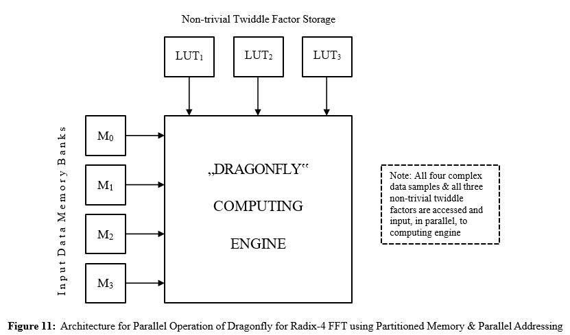 The complex-valued exponential terms, WnNk , as derived from the primitive Nth complex root of unity of Equation 2, each comprise two trigonometric components, one sinusoidal and the other cosinusoidal, with each pair being more commonly referred to as twiddle factors [5,13]. These are required to be fed, R at a time, to the computational unit used for carrying out the FFT algorithm’s repetitive arithmetic operations which, for a radix-R transform, is denoted herein by CUR (where the subscript ‘R’ refers to the radix) and involves the production of R complex-valued outputs from the multiplicative combining, in an appropriate fashion, of the R twiddle factors with R complex-valued (or real-valued) inputs.