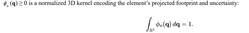 Second, while the 2-3TR-tree is efficient for point-like trajectories, it is not designed for measurements that extend spatially, such as radar resolution cells, LiDAR beam footprints, or EO pixels. Vossels explicitly include projected geometry and statistical kernels, which allows anisotropic and blurred sensor footprints to be represented as probability distributions within a voxel volume. This feature is critical for ISR data, where sensing rarely yields perfect point measurements.