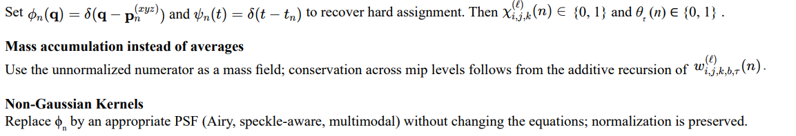 Vossels extend beyond these approaches by retaining the atomic measurement with its projected geometry, statistical kernel, anisotropy, and spectral attributes, embedding it directly into volumetric and temporal context. Unlike voxel and octree methods, they do not rely on a single discretization but allow aggregation into voxel bins and mipvol hierarchies as secondary organizational layers. Unlike point- cloud frameworks, they encode polarization, coherence, and uncertainty rather than assuming isotropy. Unlike neural encoders, they unify modalities without discarding raw fidelity or requiring task-specific retraining. Finally, unlike format standards, they constitute a mathematically grounded representation rather than a passive container.