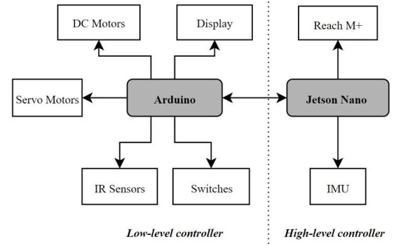 different levels of controllers allows for the distribution of control over low-level and high-level systems and components; a ROS-installed Jetson Nano as the high-level controller and an Arduino board as the low-level controller. The robot’s lowlevel components comprise three IR sensors to monitor the obstacles, two geared motors to drive the wheels, two servo motors each for the two nozzles of the spray system, and a display. The high-level components are a Reach M+ to receive RTK GPS position, and an IMU to read the attitude of the robot.
