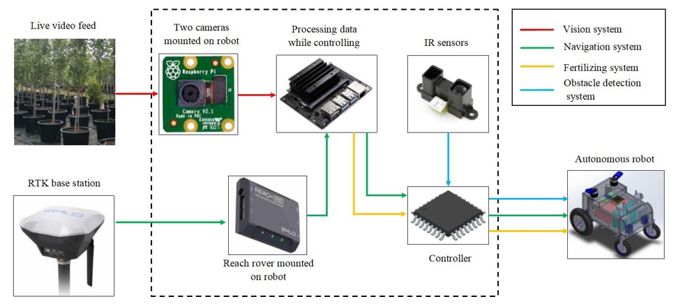 Figure 4 shows the system architecture. The RTK positioning system, which is used for localization and navigation is the main component, and the two cameras are used to see the close vicinity of the robot. The cameras stream live video to the Jetson Nano single-board computer, which processes the images to identify the plants to be sprayed.