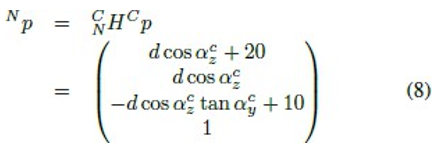 where d is the distance to the plant. The nozzle frame at its home position is aligned with the camera frame {C} and is located at (20,0,10)Tcm with respect to the camera. Hence, the homogeneous transformation matrix of the nozzle frame at its home position with respect to the camera is as follows.