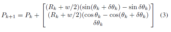 The robot’s motion within a small time interval is shown in Figure. 7. At time step k the left and right wheels travel lk = Rkδθk and rk = δθk(Rk +w) distances. The heading changes δθk and the instantaneous radius of curvature Rk of the motion are determined as follows.
