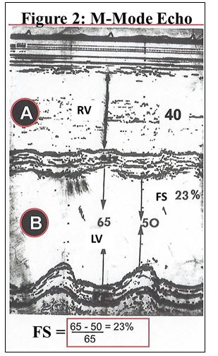 The M-mode echocardiogram demonstrates significant dilation of the right ventricle with thinned interventricular septum, great dilation of the left ventricle with thinned posterior wall, and greatly increased LV systolic diameter. The shortening fraction was 23% (figure 2). Conclusion: Severe global heart failure.