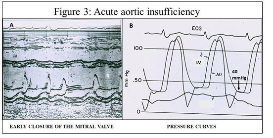 A) The M-Mode Echo recording clearly shows the early closure of the mitral valve, which incontrovertibly establishes the diagnosis of Acute Aortic Insufficiency; I emphasize that with this simple method, the diagnosis of Acute Aortic Insufficiency can be immediately established in an exact, bloodless, fast and cheap manner, which makes it possible to clarify the precise diagnosis to attempt the immediate treatment of this rapidly fatal disease.
