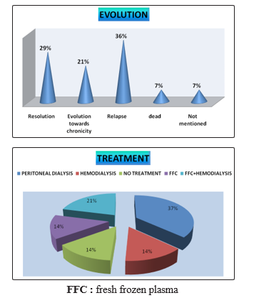 On the evolutionary level, 04 patients (29%) had evolved favorably, with a complete recovery of renal function. An AKI poorly supported, or the installation of a bilateral cortical necrosis immediately evolve the patient to the chronicity noted in 03% of our patients. In our study, we noted death in 7% of patients.