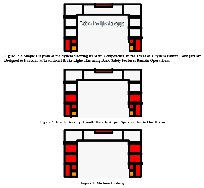 Adilights revolutionizes braking lights with a design that integrates traditional functionality with innovative, variable lights shaped like an upside-down "U." These lights enhance visibility and communication by illuminating more sections of lights as braking pressure increases. Key components include new brake light shapes, sensors at the brake and accelerator pedals, and variations sub-section in the lights for different braking intensities.