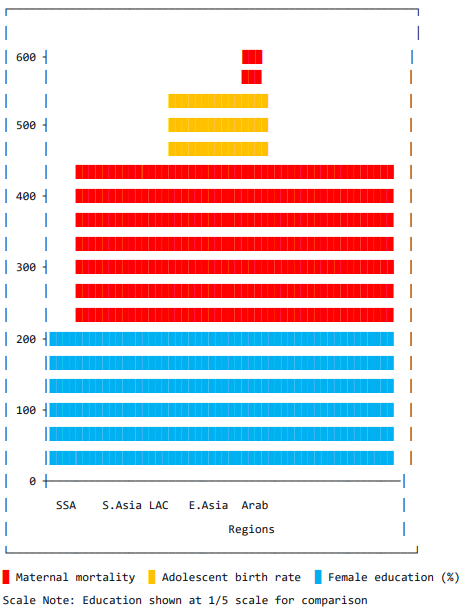 Fig. 2 provides a comparative visualization of regional averages, revealing that Sub-Saharan Africa showed catastrophic levels across all indicators, with average maternal mortality (550.1) approximately 10 times higher than Arab States (53.0) and 4 times higher than South Asia (128.3). Female education attainment in Sub-Saharan Africa (15.2%) was approximately one-third of levels in Latin America & Caribbean (52.8%).