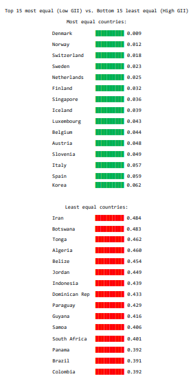 Fig. 1 visually demonstrates the stark contrast between the most and least equal countries. The Nordic countries (Denmark, Norway, Sweden, Finland) consistently demonstrate the lowest GII values, while countries across South Asia and Sub-Saharan Africa show the highest inequality levels.