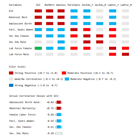 Correlation analysis reveals compelling relationships between GII components (Table 2). Adolescent birth rate shows the strongest positive correlation with GII (r = +0.84), indicating its pivotal role in driving overall gender inequality. Higher adolescent birth rates and maternal mortality are strongly associated with higher gender inequality. These health and reproductive rights indicators are key drivers of the GII. Maternal mortality ratio also demonstrates a strong positive correlation (r = +0.76), reinforcing the importance of reproductive health in gender equality.