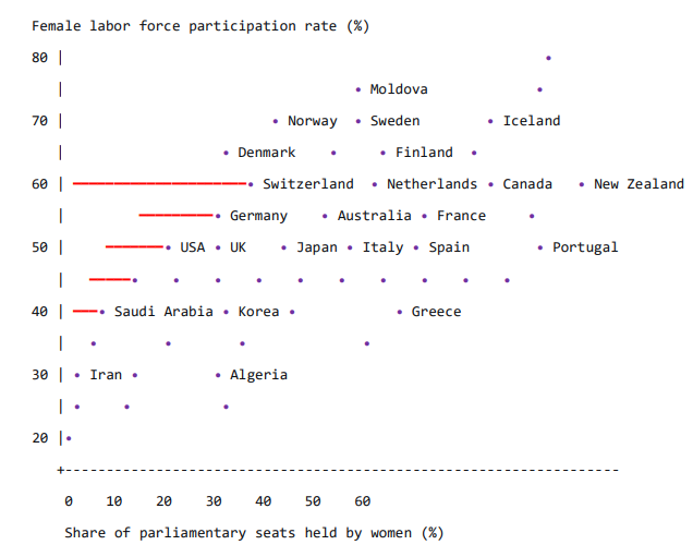 Fig. 3's scatter plot reveals a weak positive relationship (r = +0.48) between female parliamentary representation and labor force participation, indicating that progress in one empowerment dimension does not guarantee progress in the other. Countries like Cuba show high political representation but moderate labor participation, while Moldova demonstrates the opposite pattern.