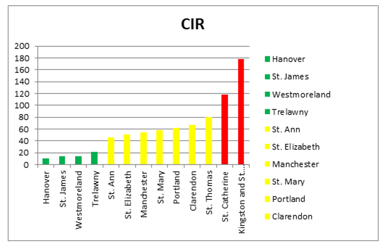 Figure 2: Bar chart comparing the crude incidence rate of all parishes