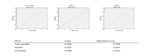 The positive likelihood ratio ranged from 22.8 (sex-pooled: I3M = 0.08) to 24.6 (males: I3M = 0.07) and to 47.2 (females: I3M = 0.09).