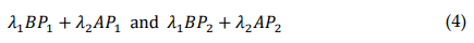 where g ≡ λ2/λ1 is the ratio of the speed of the target to the speed of the agent. Starting at points A and B, the next step is to construct point P as follows: Draw a circle of radius PA around A and draw a circle of radius PB around B so that the intersection P of these two circles forms the correct ratio with or without any scaling, as needed. Next, dropping the internal and external angle bisectors, a line segment dividing the angle APB into two equal parts gives the harmonic conjugates C and D. If the velocities λ1 and λ2 had opposite signs, then the point would have to divide the angle APB externally into the given ratio so that they are centered in the system. The coordinates of C and D are treated as a column vector of homogeneous coordinates by augmenting one and are given by