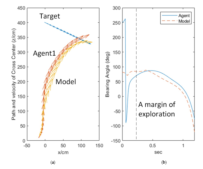 The paths and bearing angles closely matched the model predictions except for minor deviations during the initial stages of motion exploration. These deviations highlight the agents’ adjustments to perceive and align with the principal rays of the field, steering through complex paths towards optimal interception routes. This supports the idea that action shapes perception, as the continuous interaction with the environment allows the agents to refine their perceptual strategies.