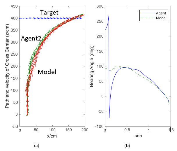 First, researchers have exhibited that human interception behavior is best accounted for by the constant bearing angle (CBA), which refers to the angle between the direction of the heading and the agent’s line of sight [23–25]. According to this model, an agent adopts a straight path to the target to keep the angle β constant, as illustrated in Figure 3a.