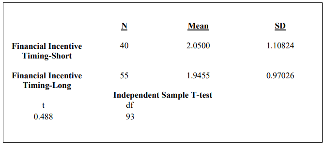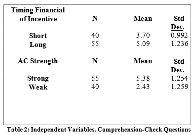 Since TIMING is a new variable not tested in the accounting literature, the study participants were asked the following question: “In the case you just analyzed, please indicate the timing of receiving the financial reward (incentive). The endpoints are labeled ‘1 = short’ and ‘7 = long’.” As expected, the analysis of the effect size for each manipulation indicated that the timing of the reward was distinct between the vignettes.