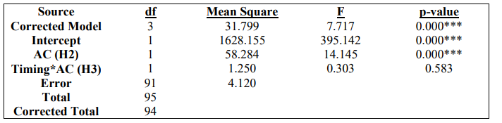 Participants were asked two comprehension-check questions to assess their comprehension of the case, and the independent variables (AC STRENGTH and TIMING) were adequately captured. On the basis of the comprehension check questions, 24 participants were excluded from the survey. Most of the short-term timing and AC strength –weak condition participants failed the comprehension checks. Therefore, it is difficult to assess why more respondents failed the comprehension checks in the short-term condition. However, based on the analysis of question 14 of the survey, which asked participants to describe the impact of the timing on their decision to whistleblow, participants in the short-term condition felt that the reward should be more immediate, and the timing was still lengthy in the short-term treatment condition. After deleting all participants who failed the comprehension checks, a one-way ANOVA was performed for the comprehension check questions relating to TIMING and AC STRENGTH. For TIMING, the difference in means was in the expected direction and significant (F (2, 93) =34.350, p =.000). The difference in means was in the expected direction for the second independent variable, AC STRENGTH, and was significant (F (1, 93) =128.302, p=000). Table 2 presents the means of the independent variables. The difference in the means for both questions indicates successful experimental manipulation [40]. For TIMING, the mean for the short-term condition was 3.70, whereas the mean for the long-term condition was 5.09. For AC STRENGTH, the mean for AC - STRENGTH – STRONG WAS 5. 38, and for AC - STRENGTH – WEAK condition, the mean was 2.43.