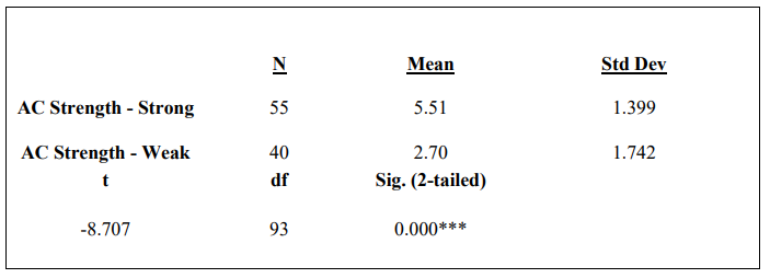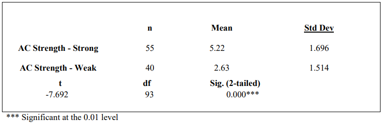 In this study, participants were asked two questions related to threats of trust and retaliation. The questions were scored on a seven-point scale. The mean value for a strong AC was 5.51, while the weak AC had a mean value of 2.70. This finding supports prior research that shows that organizational trust can mediate wrongdoing reporting. Table 5 shows the mean values for AC STRENGTH–STRONG and WEAK and the associated results.