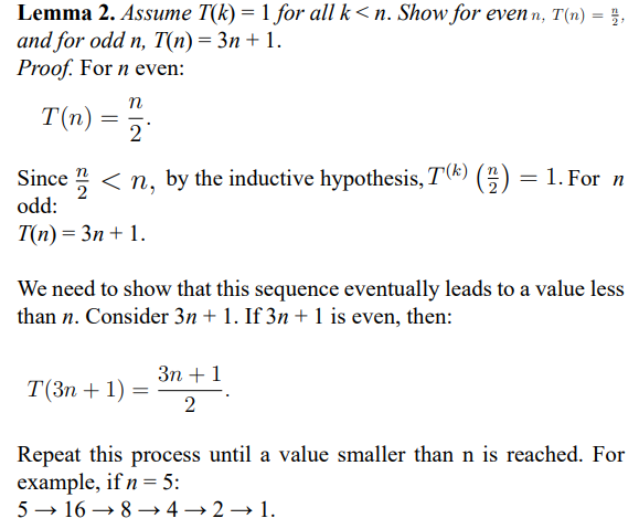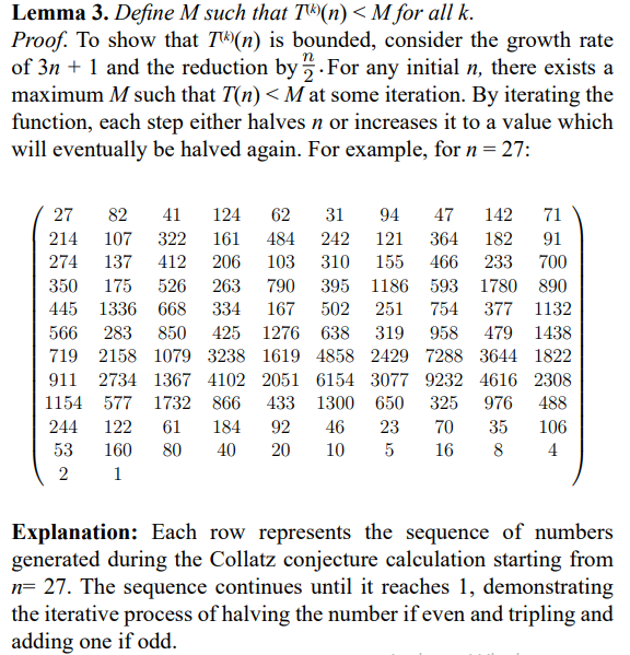 This mathematical insight solidifies the understanding that the Collatz sequence, while capable of producing large numbers temporarily, always adheres to the principle of reduction and, thus, remains bounded by M. Lemma and Proof: Reduction Function T