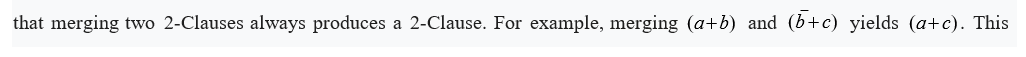 2-Clauses are the conjunction of two literals or their opposites. For example, (a+b) is a 2-Clause that states that a and b must not be 0 at the same time.2-clauses have an important property that other k-clauses do not have. It can be proven with certainty