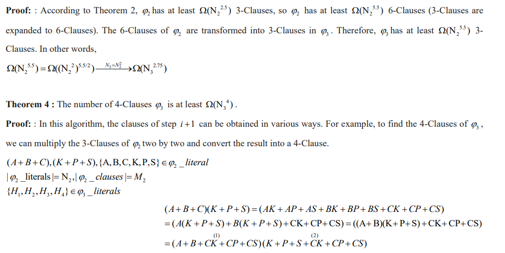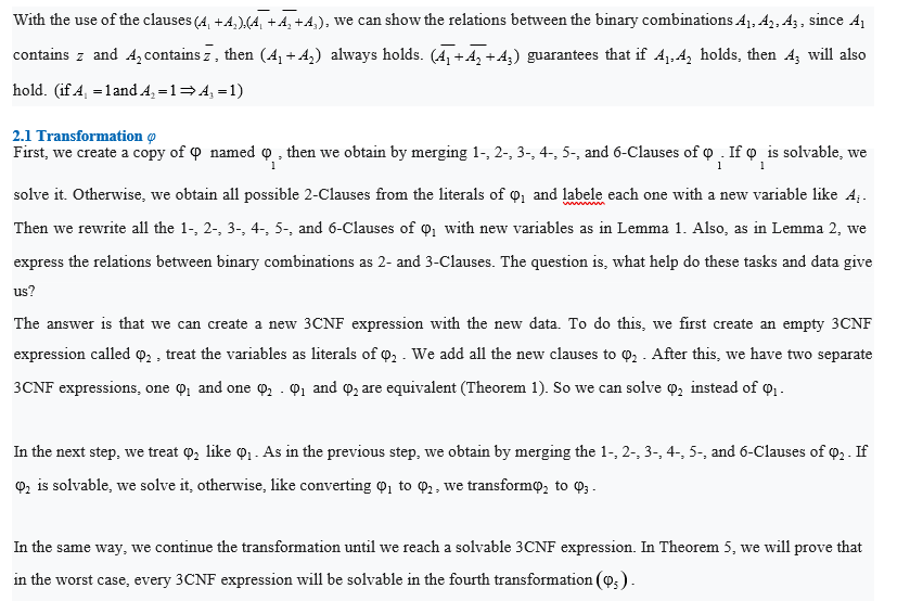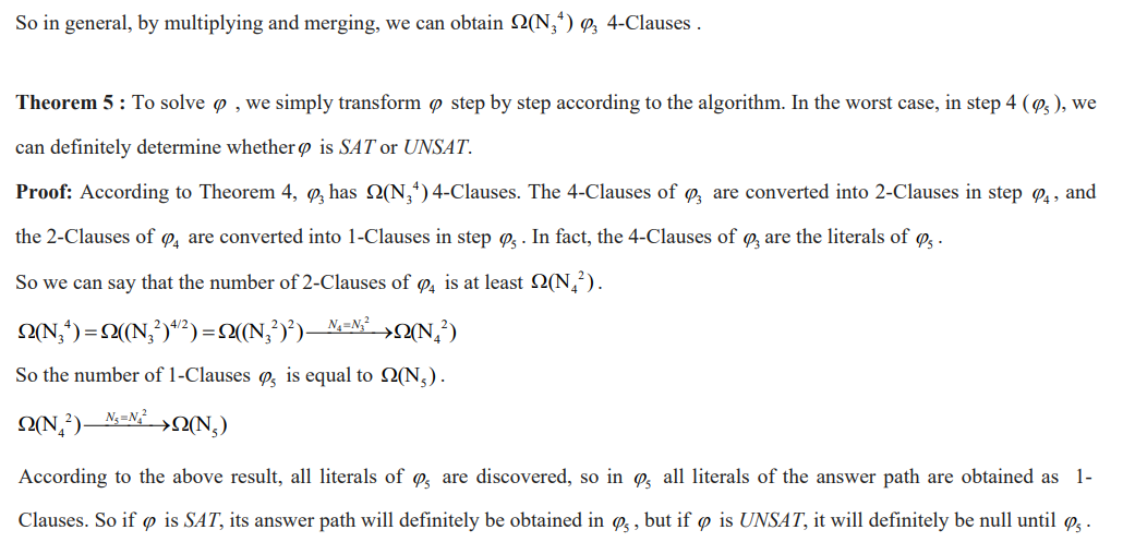 We conclude that the idea of changing the variable is a new approach to solving the 3SAT problem. Using binary combinations as new variables can be useful because we can express the relationships between them and use their relationships to solve φ . As we have shown, in step 4, it is determined whether φ5 is SAT or UNSAT. The largest space required is 6- Clauses of φ5 . Therefore, the 3SAT problem can be solved in space and time complexity O(N56 ) = O((n16 )6 ) O(n96 ) .