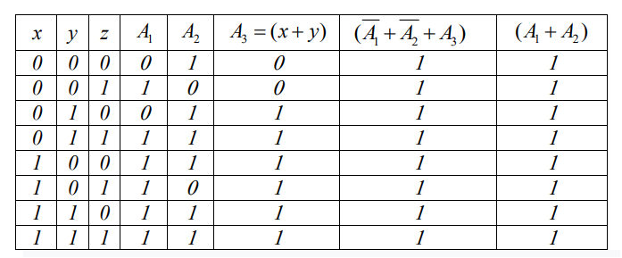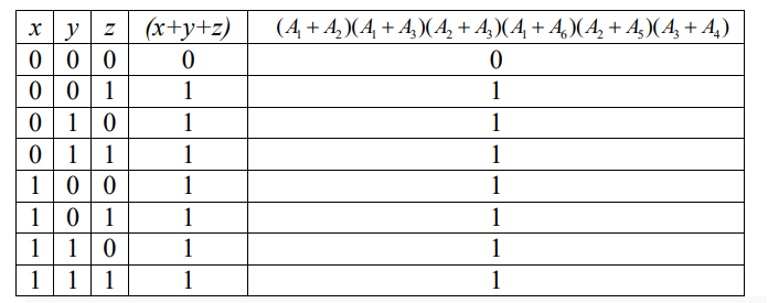 According to truth table 1, (x + y + z) and ( A1 + A2 )( A1 + A3 )( A2 + A3 )( A1 + A6 )( A2 + A5 )( A3 + A4 ) are equivalent to each other.