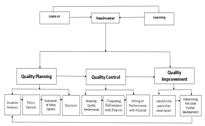 The research findings indicate that the quality control process is carried out in the following ways: 1). The school principal always coordinates with all teachers in the development of learning during the pandemic period, especially in the period before the new normal; 2) The principal always conducts routine evaluations; 3) There is always a briefing and communication with the teacher every day; 4) Continuous monitoring of the principal; 5) Receiving input and criticism from the community / parents; 6) Principals carry out intensive supervision such as requiring teachers to implement online teaching and learning activities; 7) Teacher attendance by requiring each teacher to report the teaching and learning process online. The management review, evaluation and monitoring that have been carried out by schools has the aim of continuously improving the quality of education. The things that have been done by the school in the findings of this study are part of the Juran category in quality improvement [24].