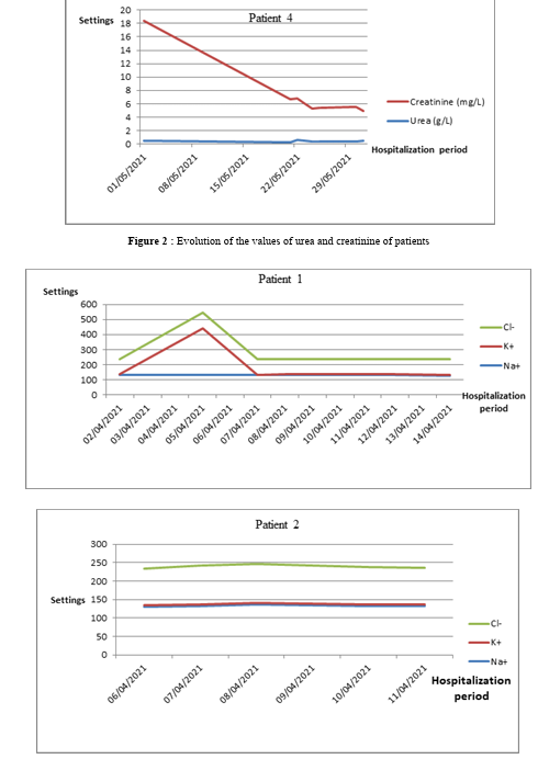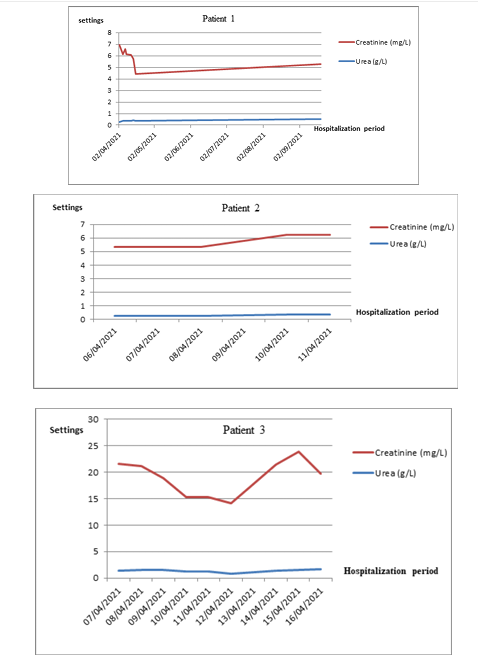 This study is established by biochemical analyzes of three analyzes (Urea, Creatinine and Blood Ionogram) of the 10 COVID-19 positive patients hospitalized at Orthopedic Institute of Med Kassab during the month of April. 4 out of 10 people had acute kidney failure during this period of hospitalization. We take the following usual values: creatinine (7-11 mg/L); urea (≤0.498g/L); Na+ (136-145 mEq.L-1); K+ (3.5-5mEq.L-1); Cl- (98-108mEq.L-1). Patient 1, aged 85 has kidney damage from day 1 of hospitalization with a creatinine estimated at 20.22 mg/L. this value then decreased without normalizing [7 - 11 mg/L], then it increased again to reach 22.37 mg/L on day 8. Urea also increased in parallel with creatinine to reach a value of 1.69 g/L on day 9 of hospitalization. The blood ionogram showed a fluctuation in the values of serum sodium, chloremia due to a hydration disorder in the patient, sepsis and probably from acute kidney injury (figure 2, figure 3). Patient 2, aged 58, was initially, creatinine and urea were normal. On day 9 of hospitalization, these 2 parameters increased successively to reach 54.9 mg/L and 1.8g/L then they gradually decreased. At the same time, serum potassium increased following an alteration of renal cells and serum sodium and chloremia remained normal (figure 2, figure 3).