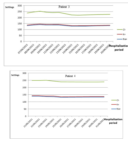 Figure 3 : Evolution of the values of blood ionogram (Na+, K+ and Cl-) of patients